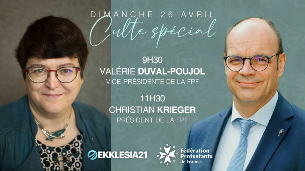 L’église Ekklesia 21 a la joie de célébrer le culte du dimanche 26 avril en présence de deux prédicateurs invités, dirigeants de la Fédération Protestante de France dont notre église a le privilège d’être membre associée :